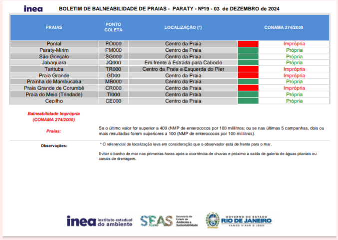 Boletim do INEA: Condições das Praias de Paraty para Banho