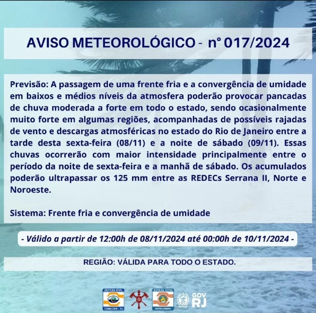 A Defesa Civil do estado do Rio de Janeiro alerta a população sobre a previsão de chuvas intensas devido à passagem de uma frente fria, combinada com a convergência de umidade em baixos e médios níveis da atmosfera. Este fenômeno meteorológico pode resultar em pancadas de chuva moderada a forte em todo o estado do Rio de Janeiro, especialmente entre a tarde desta sexta-feira (08/11) e o sábado (09/11).