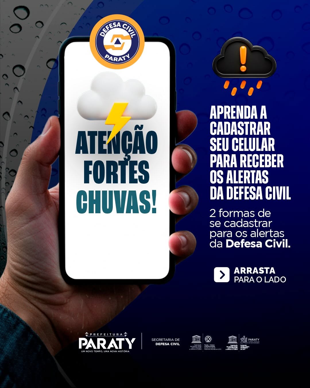 A Prefeitura de Paraty, por meio da Defesa Civil, está orientando moradores e visitantes a cadastrarem seus celulares para receber alertas de chuvas fortes e possíveis situações de risco no município. O objetivo é reforçar a prevenção e garantir que a população tenha acesso rápido a informações importantes em momentos de instabilidade climática.
