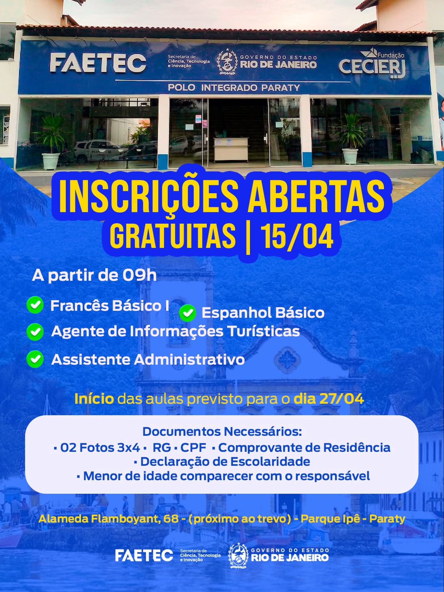 A Fundação de Apoio à Escola Técnica (Faetec) abrirá, na próxima quarta-feira (15), as inscrições para 200 vagas em cursos de qualificação profissional na nova unidade no município de Paraty, na Costa Verde fluminense.