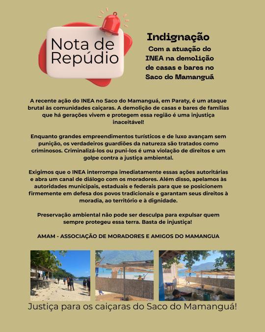A comunidade caiara do Saco do Mamangu, em Paraty, manifestou repdio recente ao do Instituto Estadual do Ambiente (INEA), que resultou na demolio de moradias e estabelecimentos familiares na regio. Em nota divulgada nesta semana, moradores classificam a operao como um ?ataque brutal s comunidades tradicionais? e uma injustia inaceitvel.