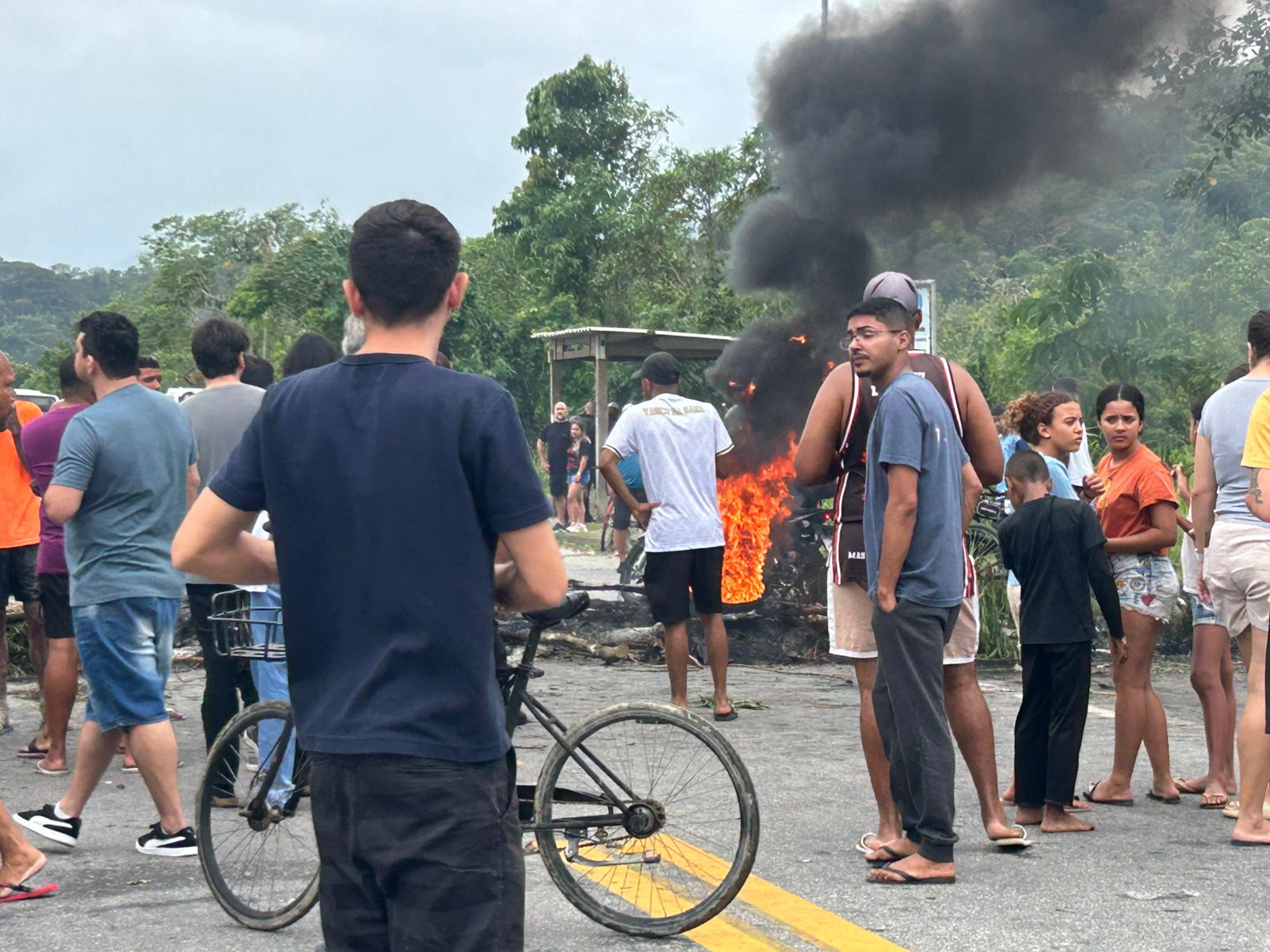 Em sinal de indignação, manifestantes montaram barricadas com galhos e árvores em chamas, interrompendo completamente o tráfego. A ação causou longas filas de veículos e gerou tensão entre motoristas e passageiros.